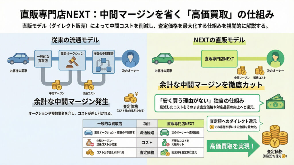 直販専門店NEXTは、 オークションや複数業者を介さず、 次のオーナーへ直接つなぐ中古車買取サービスです。中間マージンや不要な流通コストを省くことで、その分を査定価格や対応品質に還元しています。『とにかく高く買う』のではなく、 『安く買う理由がない仕組み』。 それが、NEXTの直販モデルです。